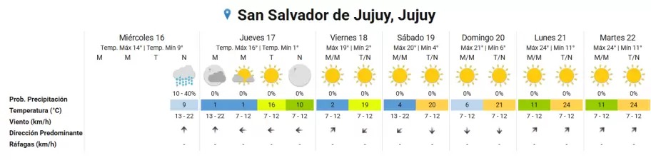 Luego de las lluvias que se registraron el miércoles, no se pronostican nuevas precipitaciones a corto plazo. Para el jueves se espera cielo parcialmente nublado, y desde el viernes hasta el martes el clima se mantendrá estable, con días mayormente soleados o con escasa nubosidad.
