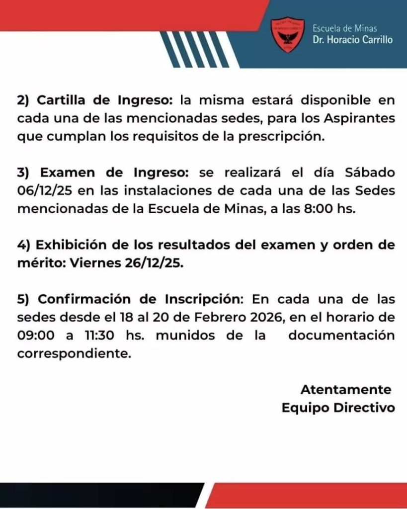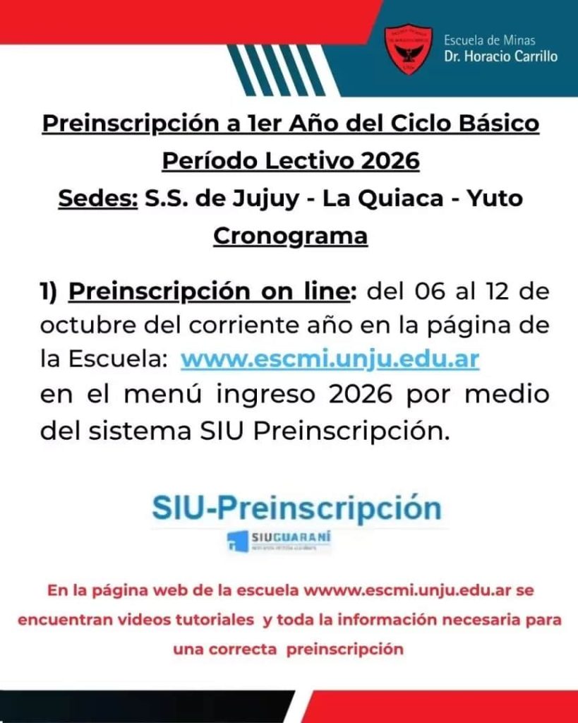 La Escuela de Minas “Dr. Horacio Carrillo”, dependiente de la Universidad Nacional de Jujuy, abre el periodo de preinscripción para el primer año 2026. Este trámite es válido para sus sedes en San Salvador de Jujuy, La Quiaca y Yuto, y se realiza de forma online desde el lunes 6 hasta el domingo 12 de octubre del presente año.