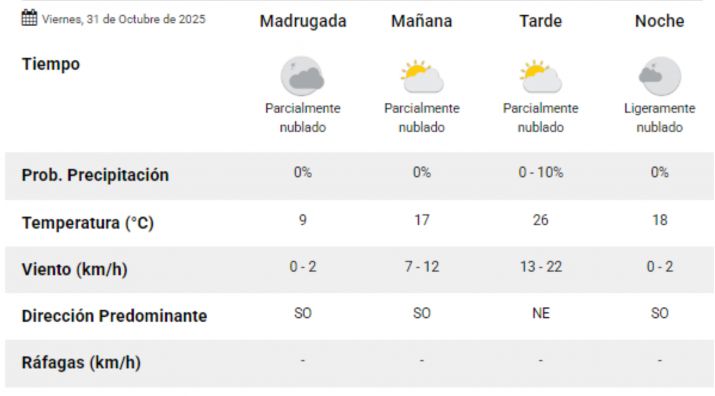 Por la mañana, el termómetro llegará a los 17°C, con cielo parcialmente nublado, mientras que la tarde se prevé cálida, con máximas cercanas a 26°C y vientos leves a moderados del noreste, de 13 a 22 km/h. Durante la noche, el cielo estará ligeramente nublado y la temperatura bajará a 18°C, con vientos suaves del sudoeste.