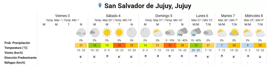 El calor regresará con intensidad a Jujuy durante este fin de semana. Según el Servicio Meteorológico Nacional, el sábado 4 de octubre será un día soleado, con una máxima de 33°C y una mínima de 14°C, sin previsión de lluvias.