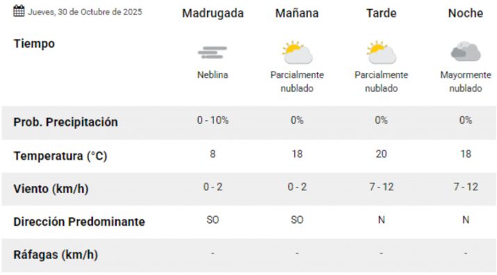 Durante la madrugada, se anticipa neblina y una mínima cercana a los 8°C, con vientos suaves del sudoeste entre 0 y 2 km/h. En la mañana, el cielo estará parcialmente nublado y la temperatura subirá hasta los 18°C, mientras se mantendrán los vientos leves desde la misma dirección.